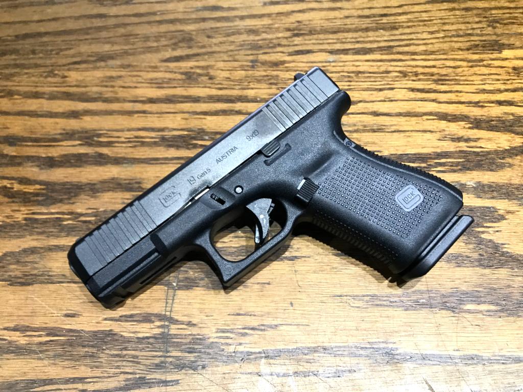 Glock, 19 Gen5, Striker Fired, Compact, 9MM, 4.02" Marksman Barrel, Polymer Frame, Matte Finish, Fixed Sights, 15Rd, 3 Magazines, Ambidextrous Slide Stop Lever, Flared Mag Well, nDLC Finished Slide and Barrel, No Finger Grooves, Front Serrations