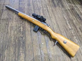 Custom mauser action with 45 Win Mag heavy stainless barrel. Uses modified M1 carbine magazine. Beautiful wood stock.