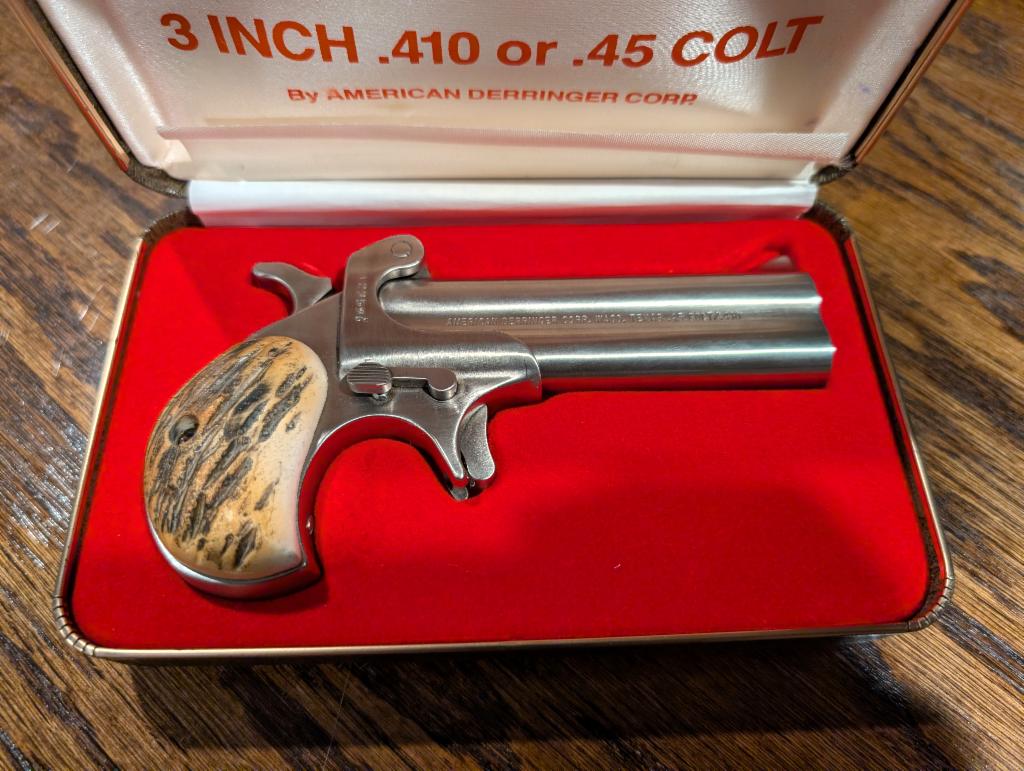 Like new in original box. Stainless finish, 4" barrel, two shots, single-action, 45 Colt or 410 shotshell. Horn grips.