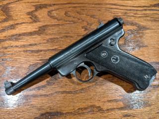 Good condition rimfire pistol. Blued finish, black grips, fixed sights, frame-mounted safety, four magazines. Finish and grips in very good condition except for small blemish on barrel.