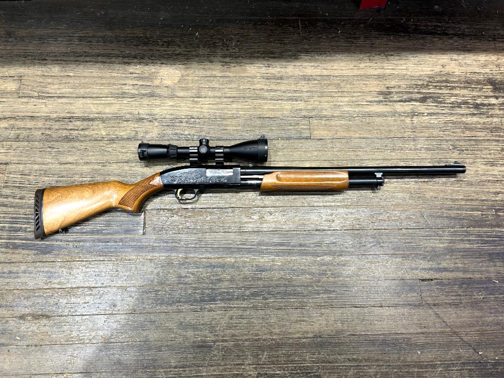 USED in Very Good Condition Mossberg 500A Pump Action Shotgun in 12GA with 24" Slugster barrel with Iron Sights and 24" Vent Rib Accu-choke Barrel. "Engraved" Receiver, Comes with Field and Stream 3-9x Scope