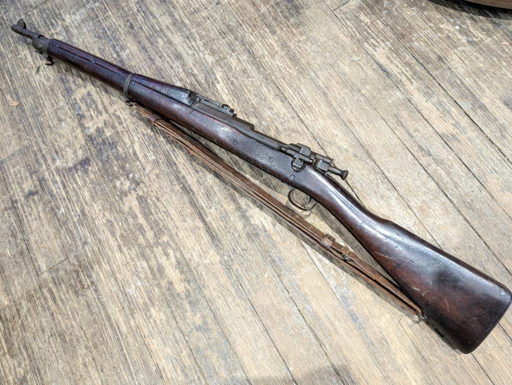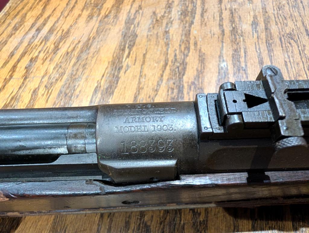 Good condition early 1903, likely 1907 production date. Arsenal rebarrelled in September of 1919. Original sling. Stacking swivel broken. Stock and finish show wear and blemishes appropriate with age and use of the rifle.