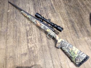 Good condition bolt gun. Synthetic camo stock, black receiver and 22" barrel, Bushnell scope, one magazine.