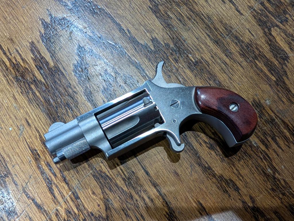 USED in AS NEW UNFIRED Condition North American Arms Mini SAO Revolver in 22LR with 1.125" Barrel. Matte Stainless Finish, Wood Grips, Fixed Sights, 5 Rounds. Original Box with Soft case