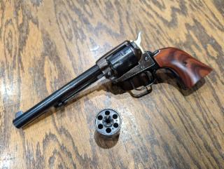 Excellent condition in original box. Blued finish, 6.5" barrel, wood grips, single-action only, two cylinders.