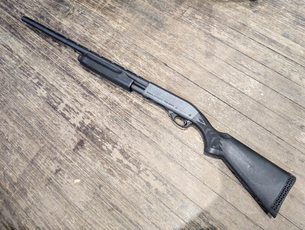 Good condition pump-action shotgun. Black finish, 25" vent-rib barrel, synthetic furniture, choke installed.