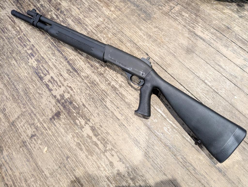 Good condition semi-auto shotgun. Pistol grip stock, Scattergun Tech sights, large charging handle, extended magazine tube. Finish shows wear from age and use but no signs of abuse or corrosion.