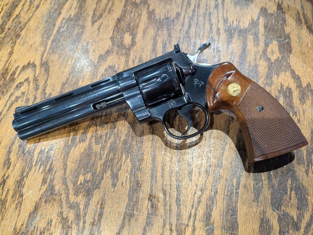 Excellent condition in original box. Serial number places it at 1961 production year. 6" barrel, blued finish, 6-round cylinder, wood grips, adjustable rear sight. Finish is about 98% or better. Box has seen better days.
